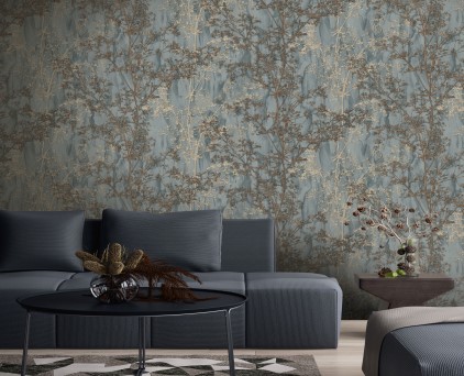 Фоновые обои нельзя обозначить как какой-то конкретный узор. Здесь можно увидеть и хаотичное движение холодных потоков воды, и срезы камня, и очертания скалистых берегов, и плотный туман на рассвете. На таком сложном базовом рисунке на декоративных полотнах добавлены ветки растений. Сами флористические элементы двух цветов, но с добавлением минимального количества серебряных блесток. Такой сложный минимализм, при правильном подборе мебели и акцентных аксессуаров, может создать интерьер в стиле не только модерн, но и романтизма.